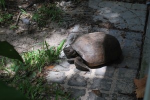 We have a lot of protected gopher tortoises that live around our little plot of land, but sometimes they stop by to say “hey” and sun themselves on the porch.