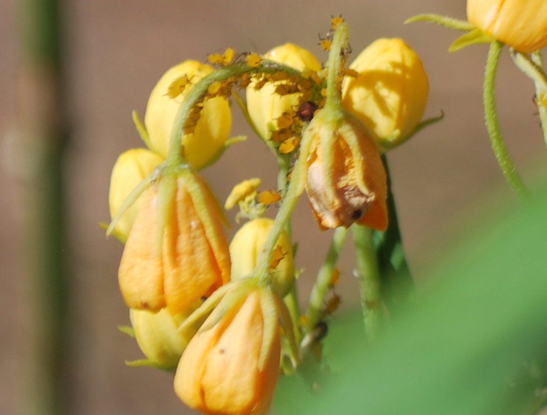 Aphids come in a few colors, but the ones that have infested my milkweed are bright yellow. They can also be brown, black or red. Since they are a pest, I insisted on getting rid of them on sight when they first appeared as a yellow blanket all over my milkweed. I have changed my mind since then. After a lot of reading, I have come to understand that the aphid is the base meal of other beneficial beasties in the garden. However, that doesn’t mean let them infest your garden!